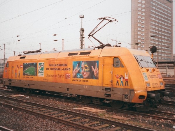 Enthüllt: Die noch am Bahntag 1999 verhüllte 101 001-6 steht hier mit ihrer nun sichtbaren Werbung für die Fußball-WM 2006 im März 2000 im Vorfeld des Frankfurter Hauptbahnhofes.
